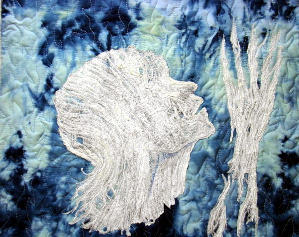 Ik heb met discharge gewerkt, gebleekt, gestempeld, gemonoprint enz. Zelf geverfde stoffen, commerciele stoffen, batik en zeem(leer). De kruin van de boom is een rest van gestempelde stof en past er toevallig heel goed bij.